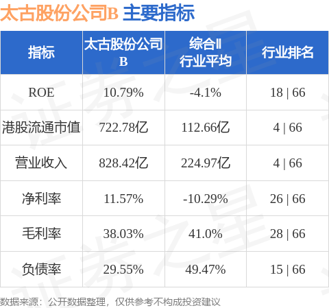 太古股份公司B港股市值722.78亿港元,在抽象Ⅱ行业中名次第4。主要隘点见下表: